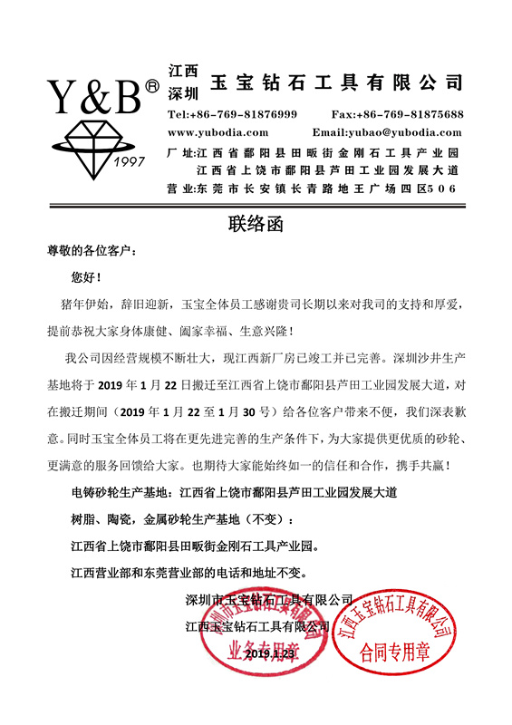 承蒙您長(cháng)期以來(lái)大力支持與配合,在此,玉寶全體員工謹表示由衷的謝意!因我司業(yè)務(wù)發(fā)展需要和公司規模的擴大,自2019年1月22日起,深圳工廠(chǎng)將搬遷至新的地區,具體聯(lián)系方式附后。給您帶來(lái)的不便,我們深表歉意!我司將以此次搬遷為一個(gè)新的起點(diǎn),竭誠為各位尊敬的客戶(hù)提供更加滿(mǎn)意的服務(wù)與合作,并再次感謝您長(cháng)期以來(lái)給與的支持與關(guān)注!